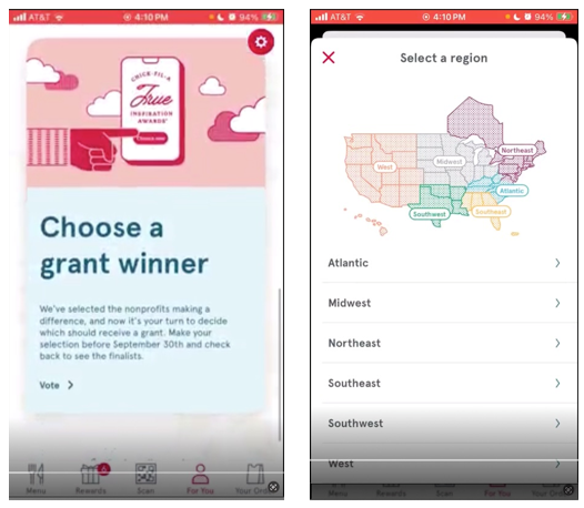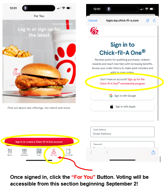 Beginning Sept. 2, cast your vote within the Chick-fil-A app. Download the App if needed >>